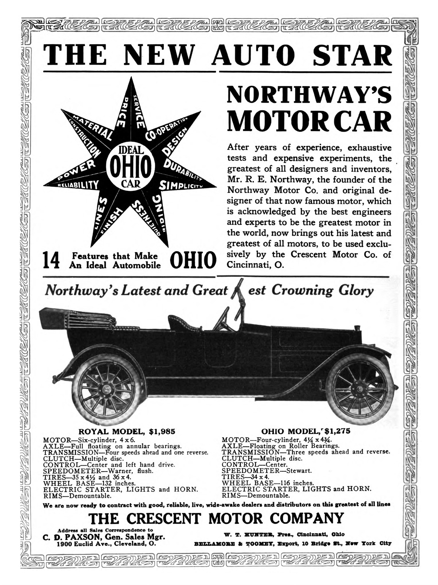 After years of experience, exhaustive tests and expensive experiments, the greatest of all designers and inventors, Mr. R.E. Northway, the founder of the Northway Motor Co. and original designer of that now famous motor, which is acknowledged by the best engineers and experts to be the greatest motor in the world, now brings out his latest and greatest of all motors, to be used exclusively by The Crescent Motor Company.