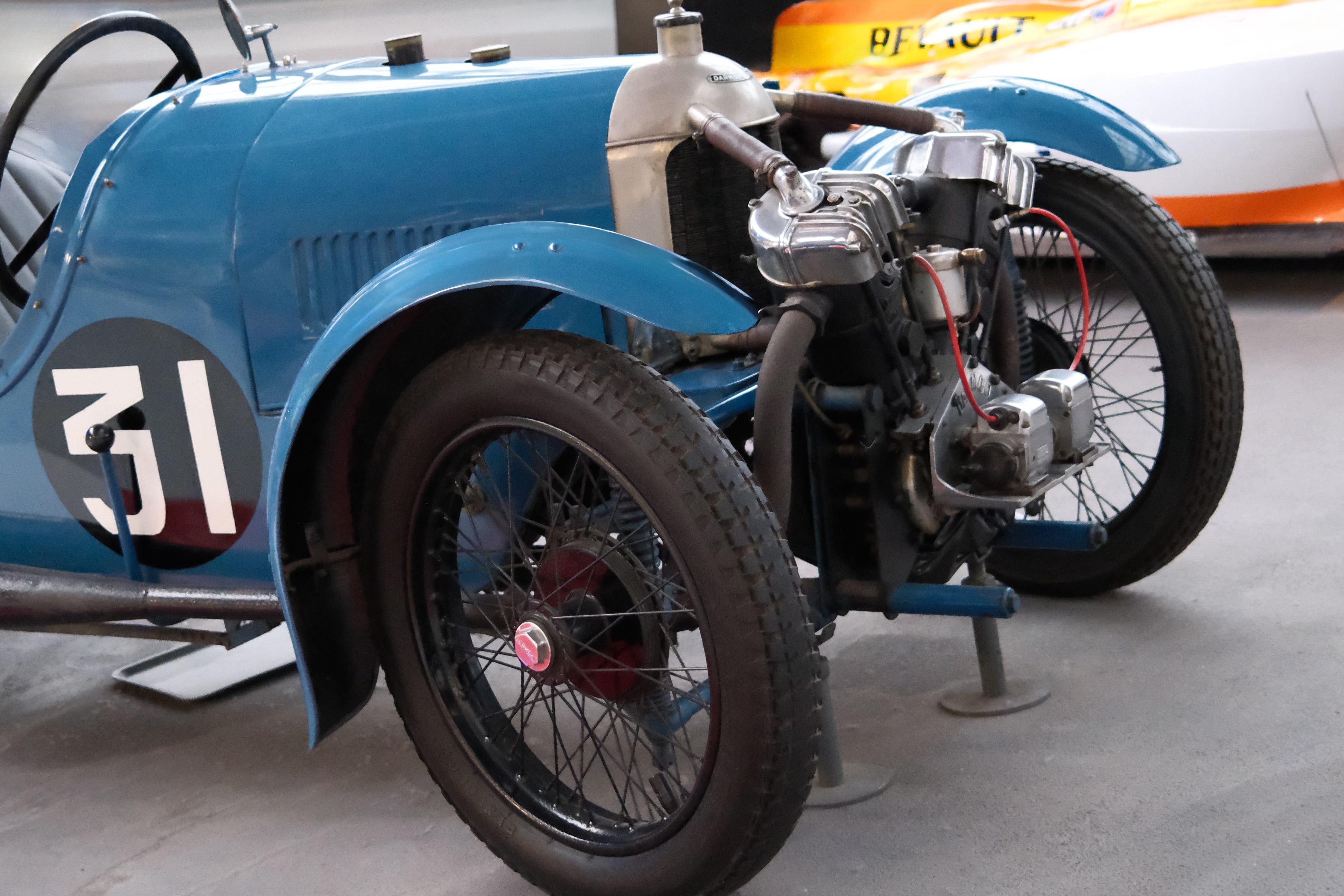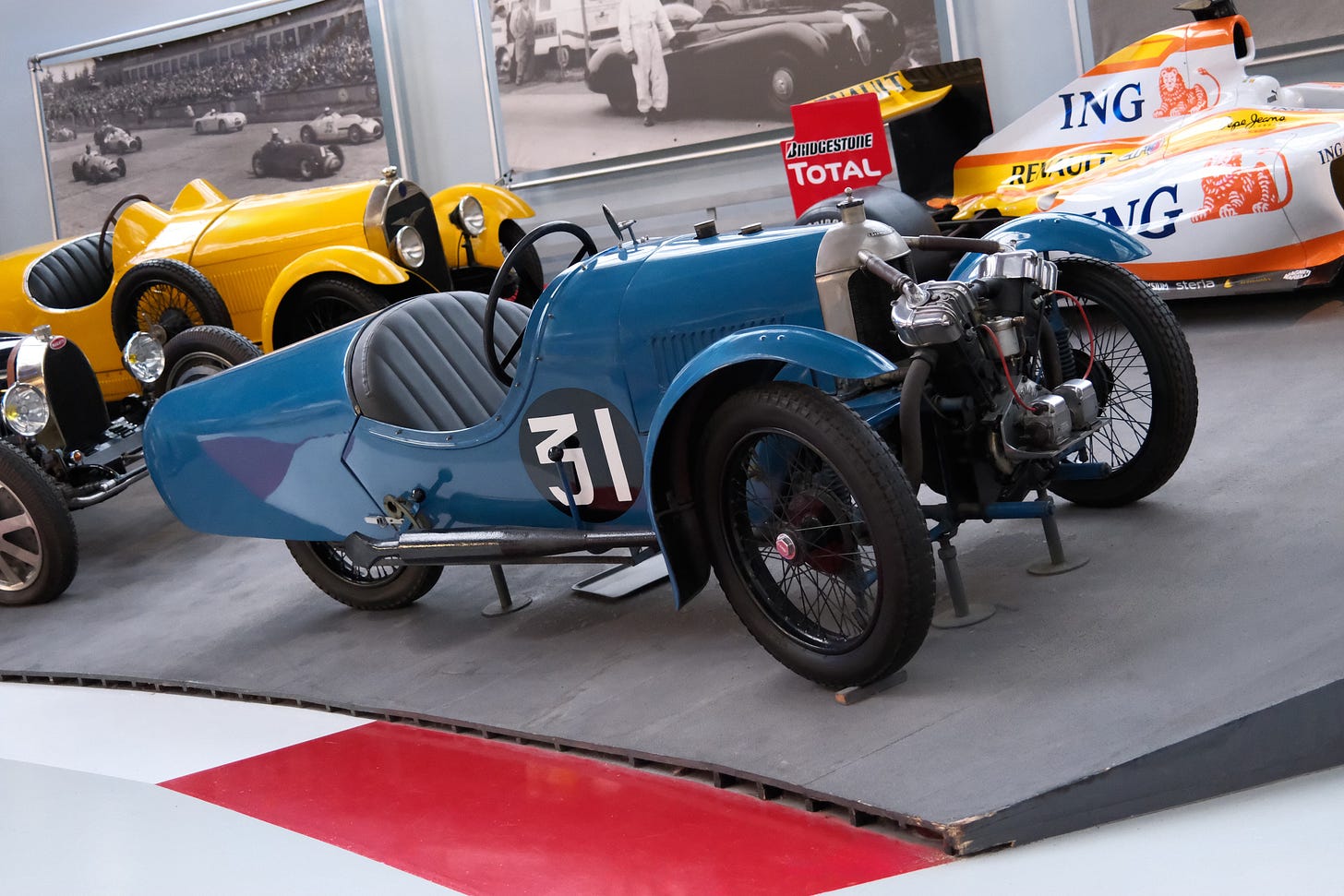 As with many early Morgan-derived three-wheelers, the DS Special had no reverse gear. Drivers relied on physically maneuvering the car backward—perfectly normal for ultra-light cyclecars of the period. The example below is at Autoworld in Brussels, Belgium.