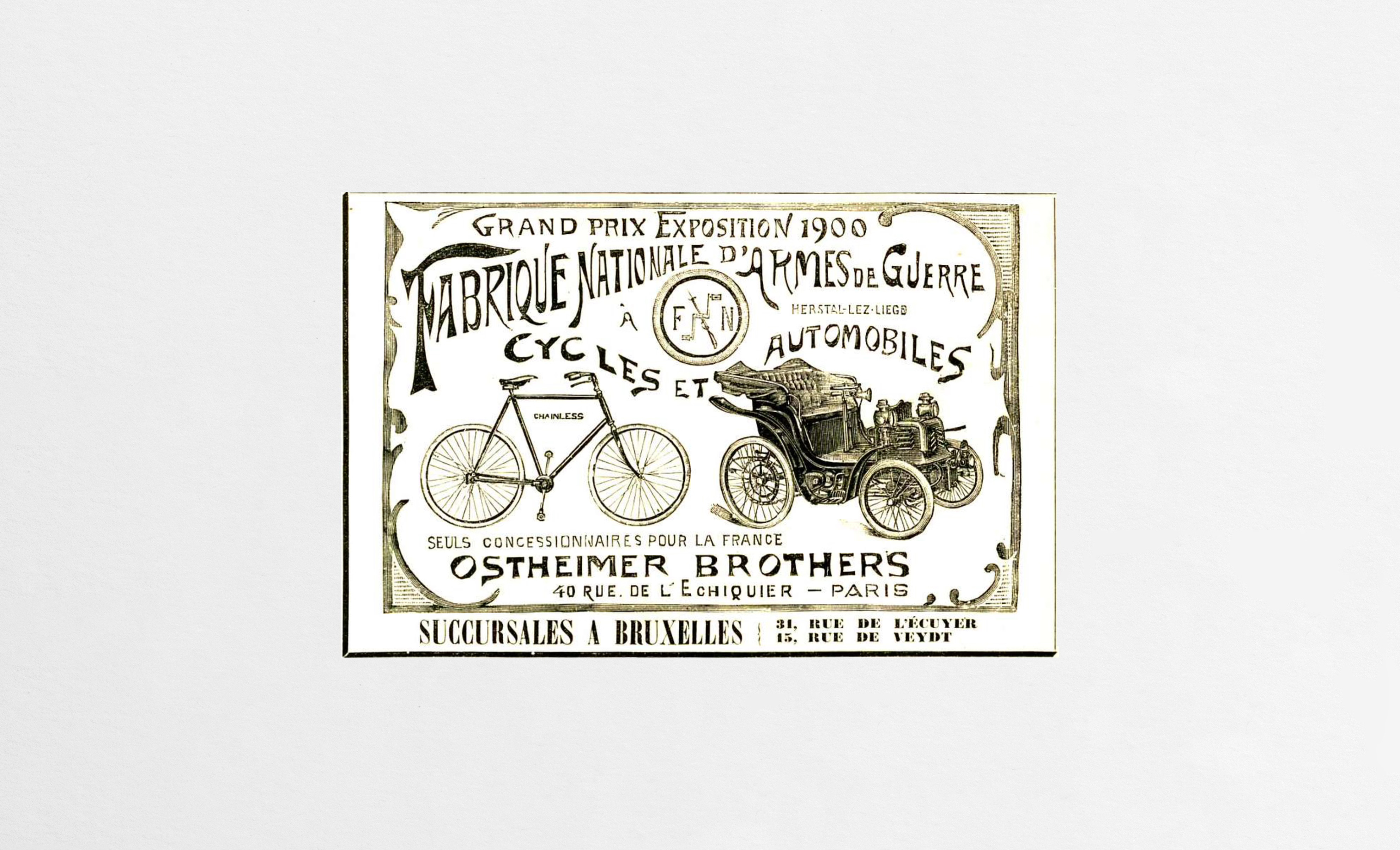 The Fabrique Nationale (FN), today the Herstal Group, produced bicycles and motor-powered vehicles with 2, 3 and 4 wheels which made the reputation of Belgian cars and motorcycles for 65 years, from 1901 to 1935 for cars and from 1901 to 1965 for motorcycles and other vehicles.