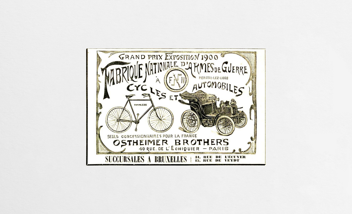 By the 1890s, FN expanded into manufacturing bicycles, applying its precision engineering skills to the growing personal-transportation industry. This soon evolved into producing motorcycles (beginning in 1901) and eventually automobiles.