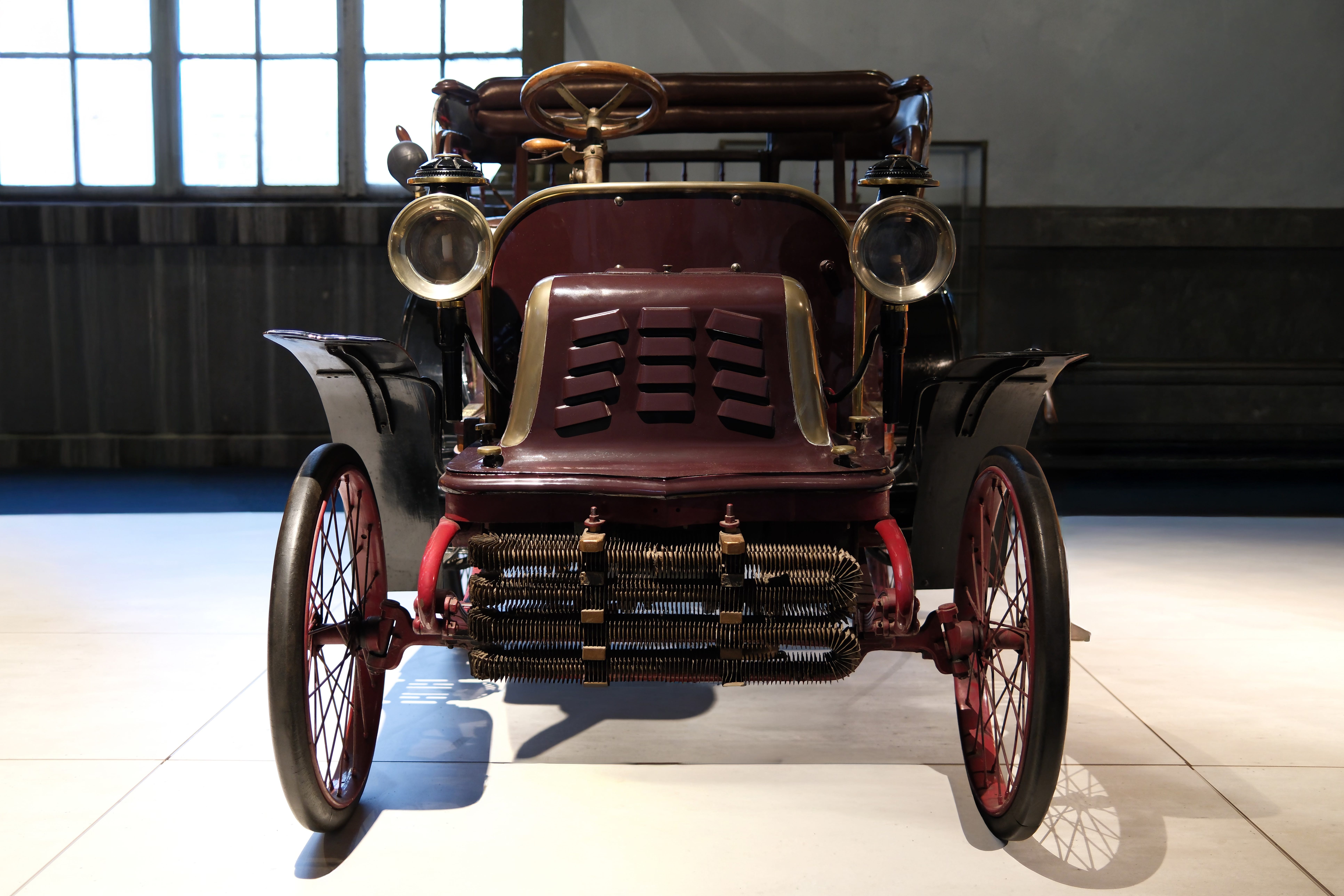 The first four-wheel FN, designed by De Cosmo in 1899. Tonneau coachwork, with curved wooden flanks and small rear door. The transversal engine is fitted in the front. The starting handle needed to be slotted through the right front wheel. The accelerator and gears are on the steering wheel. The inclined steering column reveals it to be one of the later models. Near on one hundred models were built between 1900-1901. Not bad for that era! (source: Autoworld).