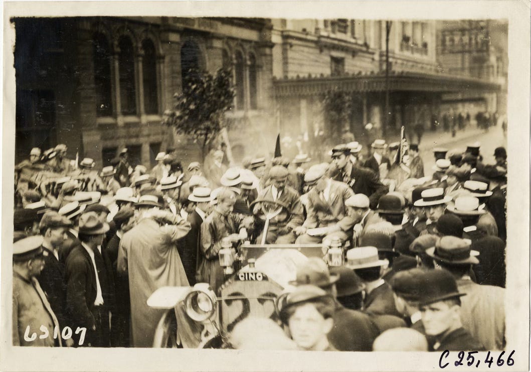Crowd of spectators surrounding motorists in Cino car no. 22 during the 1910 Munsey Historic Tour. Organized by the Munsey newspapers, the endurance contest covered a route through ten states. (source: National Automotive History Collection, Detroit Public Library)