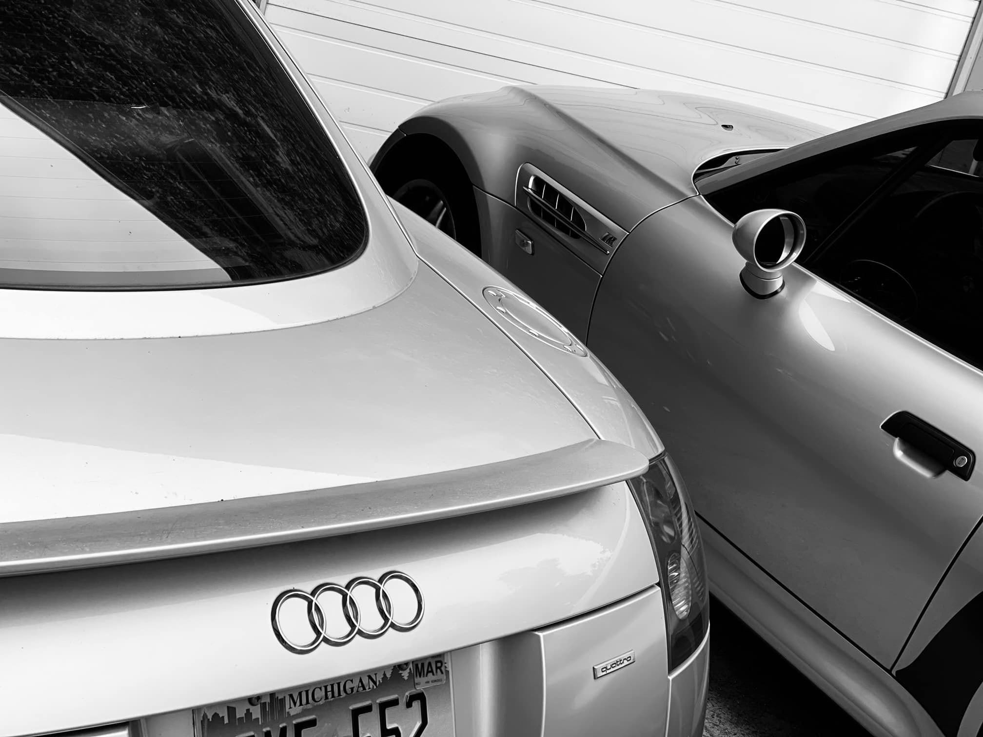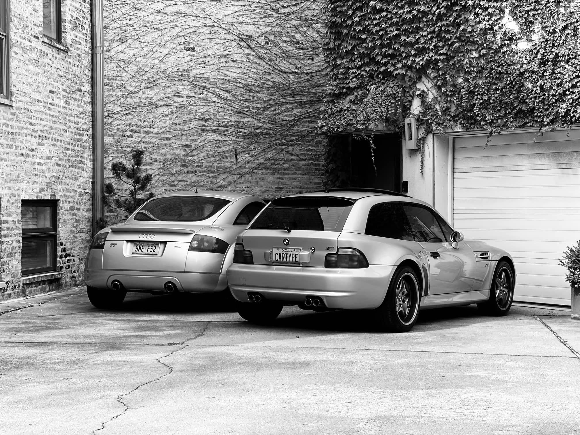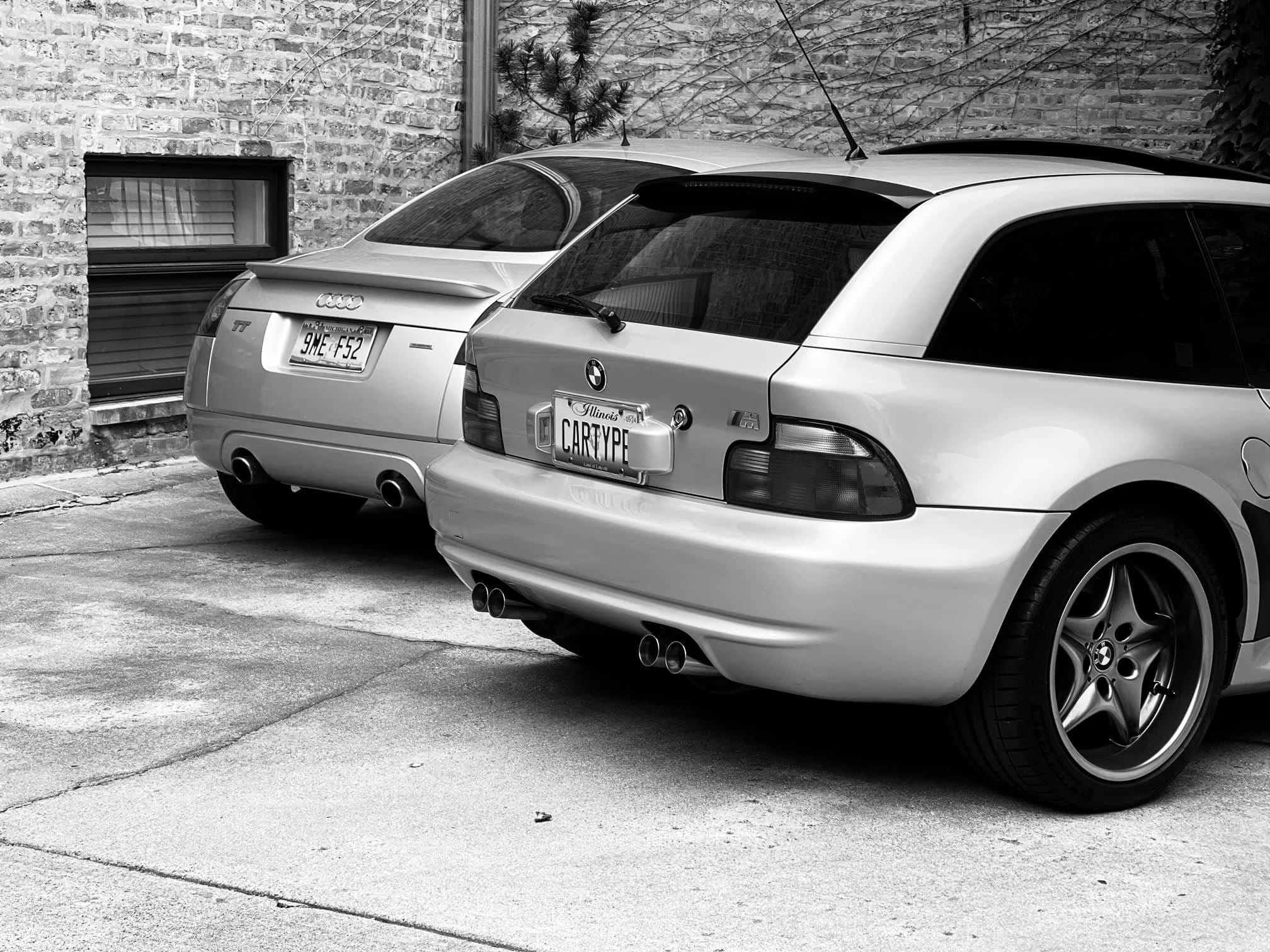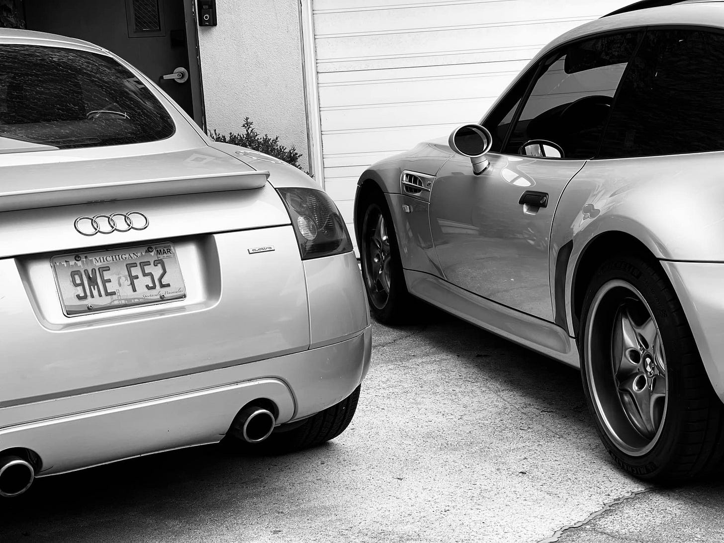 Here is a 2001 BMW M coupe (lovingly known as the “Clownshoe”) and a 2001 Audi TT 225 Quattro Coupe, both with manual transmission.