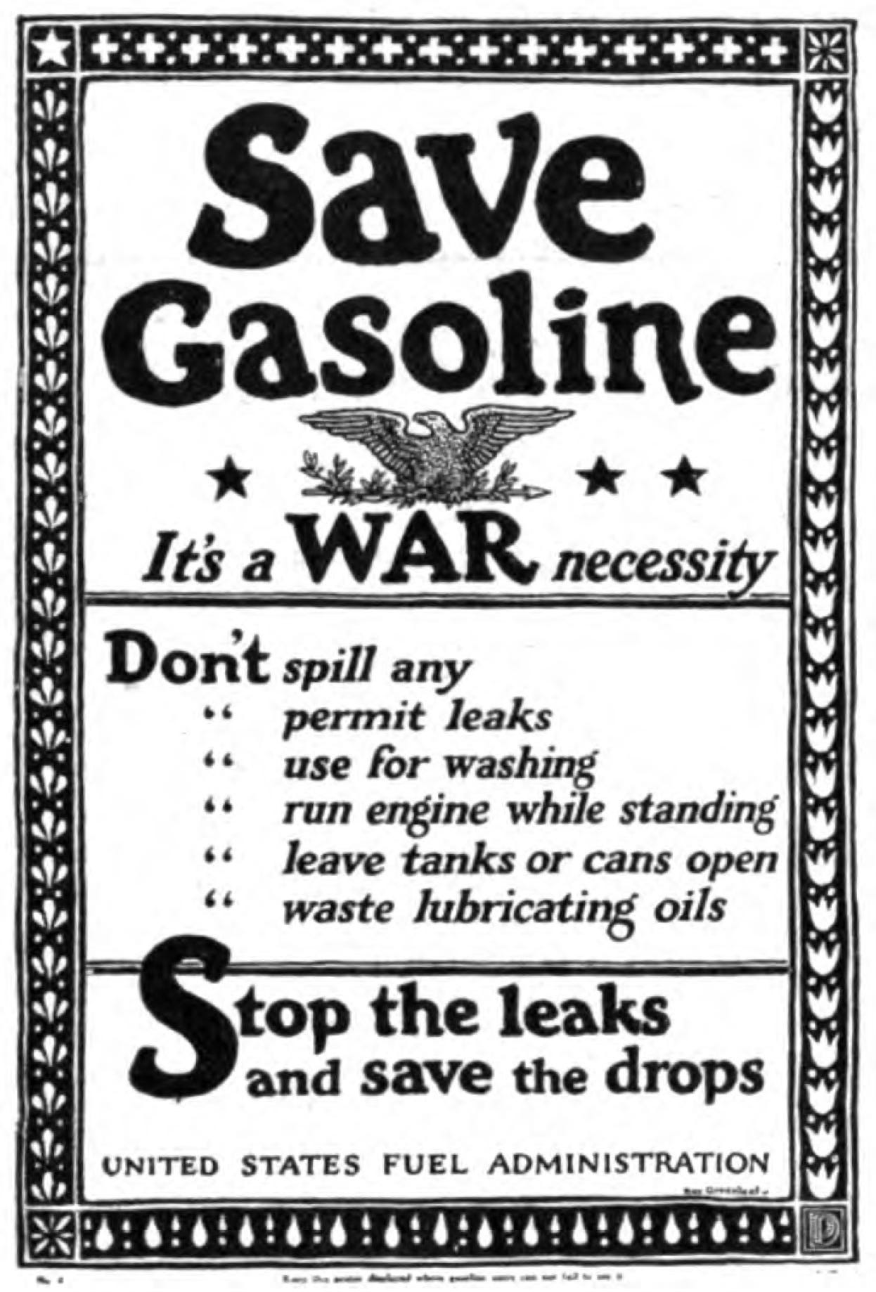 The conservation department plans to establish oil conservation districts throughout the country, placing motor car dealers at the head of each district together with committees to be composed of newspaper men, motor club representatives, oil industry representatives, garagemen and dyers and cleaners. These committees in turn will appoint deputies for each county. Huge posters will be displayed everywhere, and all garages and oil stations will be instructed in every means of gasoline and oil conservation.