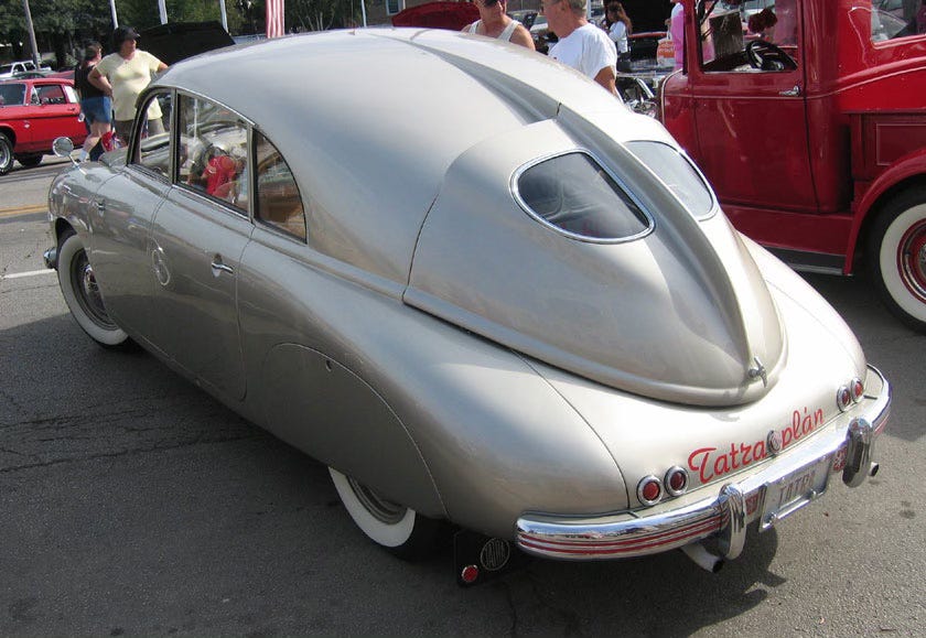 Tatra’s specialty was luxury cars of a technically advanced nature, going from aircooled flat-twins to fours and sixes, culminating (briefly) with the OHC 6 litre V12 in 1931. In the 1930s, under Austrian engineer Hans Ledwinka and his son Erich, and protected by a high tariff and absence of foreign assemblers, Tatra then began building advanced, streamlined cars, which started in 1934 with the large Tatra T77, the world’s first production aerodynamic car. The fastback T77’s drag coefficient of 0.212 is rarely bettered even by the sleekest of modern cars. It featured (as did almost all subsequent big Tatras) a rear-mounted, air-cooled V8 engine, which was in technical terms very sophisticated for the time.