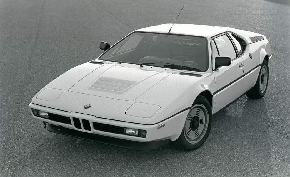 The first true BMW “M” car was the BMW M1 (introduced in 1978). It was designed as a homologation car for racing with styling by Giorgetto Giugiaro.