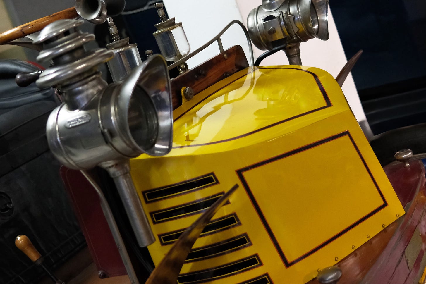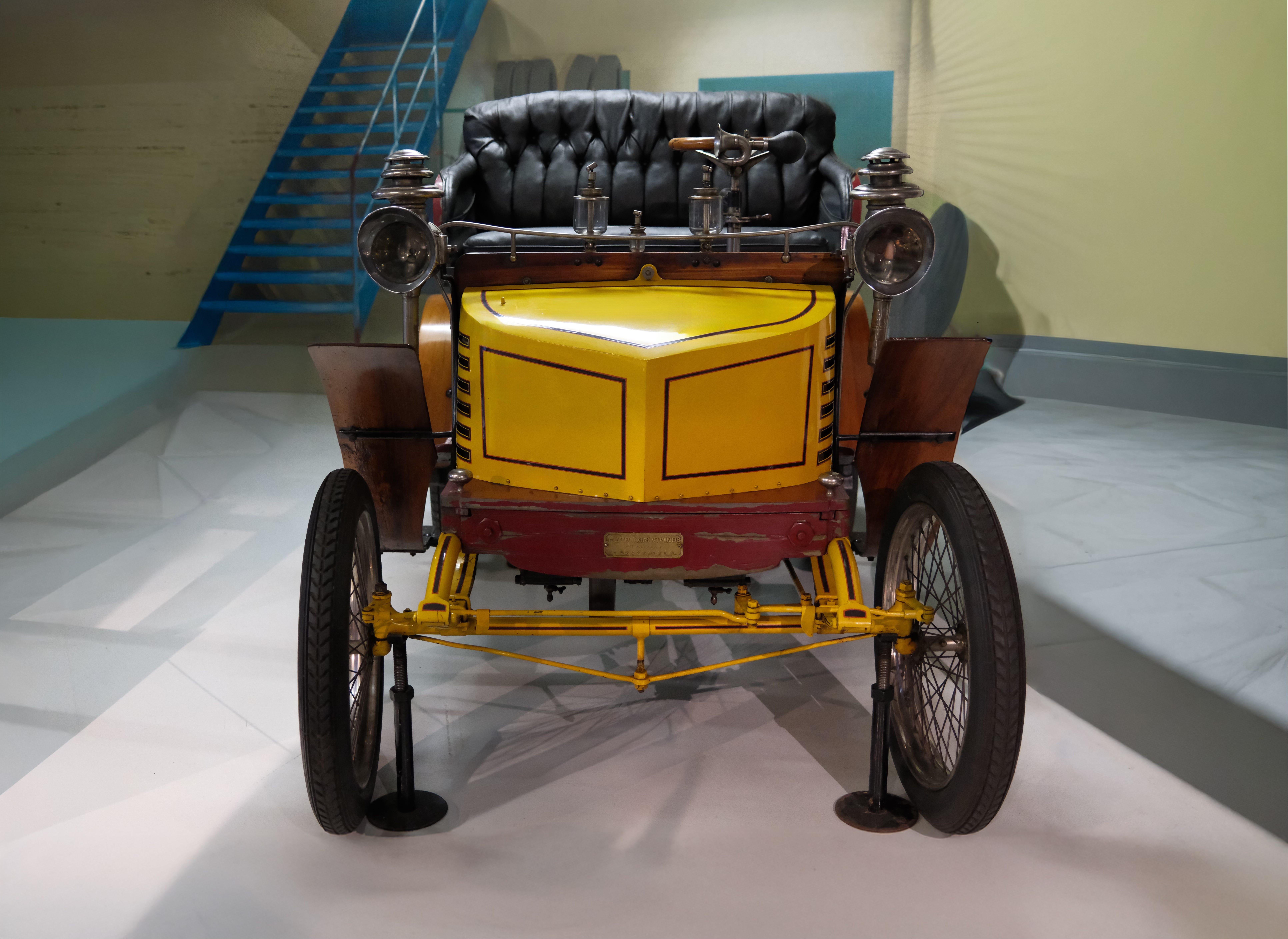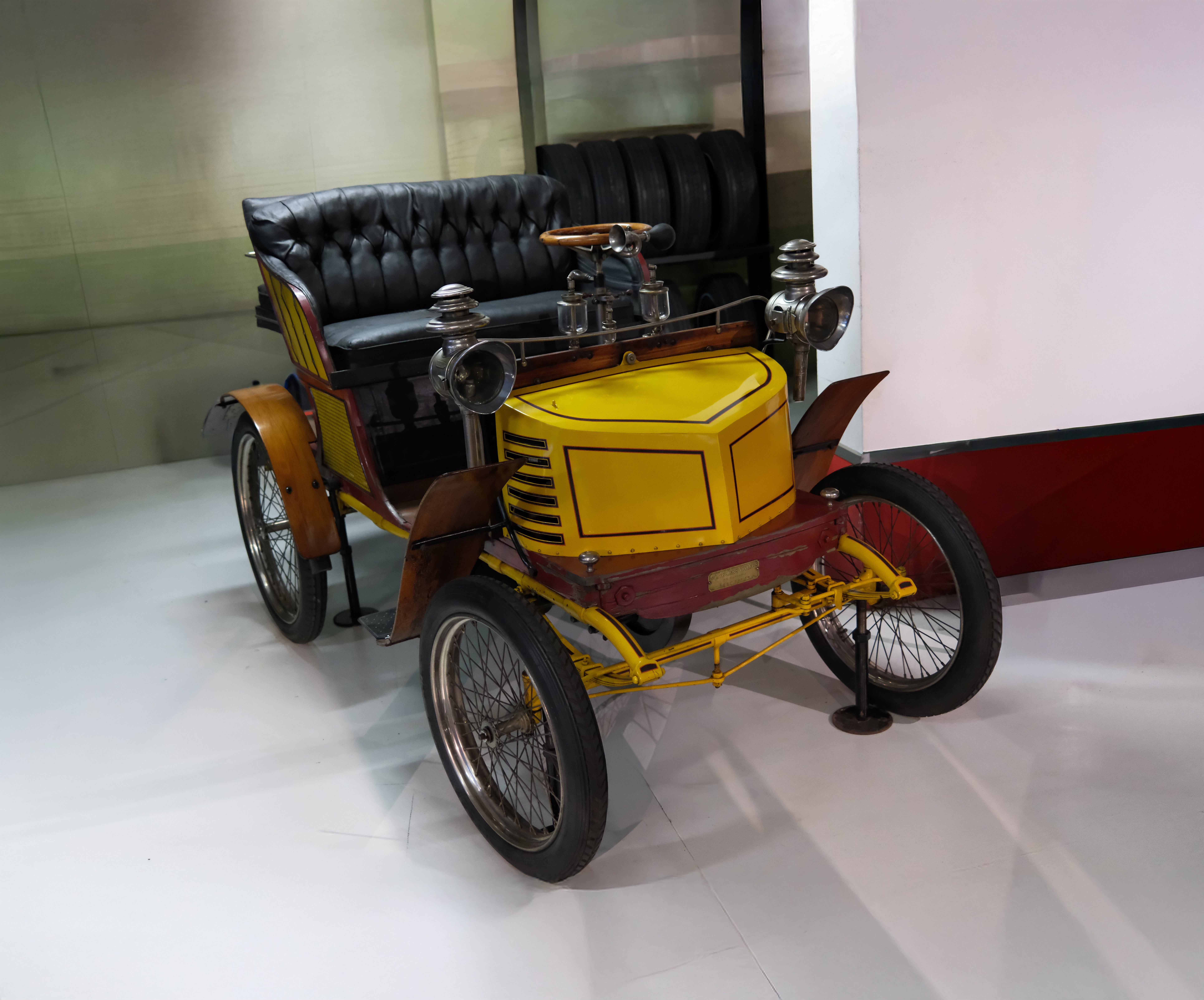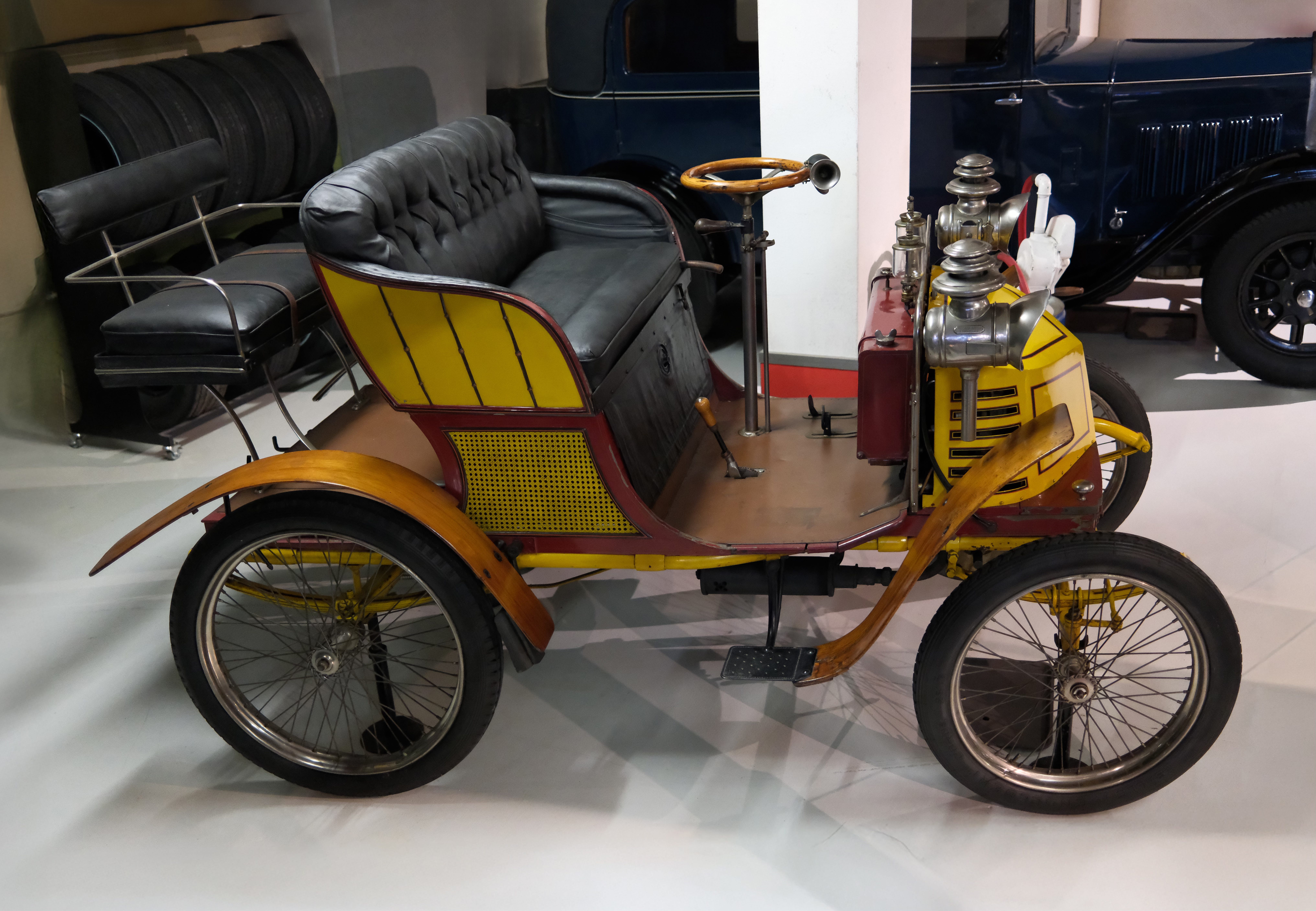 The 1900 Vivinus Due shown below, and currently on display at Autoworld, was presented by King Leopold II to Baroness de Vaughan. Bodied by D’Ieteren Frères, it uses belt drive to the rear wheels and has two forward speeds but no reverse gear—typical of the lightweight Belgian voiturettes of its era.